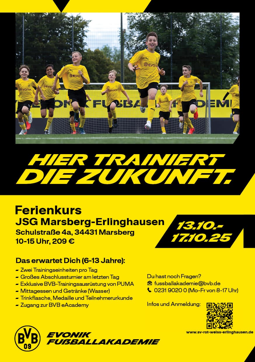 | Vom 13. bis 17.10.2025 ist wieder die BVB Evonik Fußballakademie zu Gast in Erlinghausen. Die Anmeldung ist nur bei uns bis einschließlich 04.10.2025, 12.00 Uhr möglich: Anmeldeformular...(pdf-Datei) | |