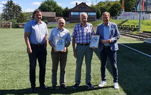 | Zu einer harmonischen, sonnigen und kurzen Mitgliederversammlung traf sich am Sonntag, 07.08., der Sportverein Rot-Weiß Erlinghausen im Hans-Watzke-Stadion. Sportlich können die Rot-Weißen auf ein erfolgreiches Jahr zurückblicken. Die erste Mannschaft beendete die Landesligasaison auf Rang 5 und konnte den Kreispokalsieg erringen. Die Reserve schoss in der Kreisliga B über 100 Tore und erreichte einen zweiten Platz. Dementsprechend zufrieden zeigte sich der erste Vorsitzende Hans-Joachim Watzke. Watzke bedankte sich besonders bei Vaidas Petrauskas für dessen langjährige und erfolgreiche Trainertätigkeit und wünschte Nachfolger Benedikt Müller viel Erfolg. Finanziell bleibt der Verein weiterhin solide aufgestellt, mit den neuen Räumlichkeiten in der „Alten Schule“ wurde die Infrastruktur noch einmal optimiert. Die Versammlung bestätigte Oliver Dülme einstimmig im Amt des stellvertretende Vorsitzenden, auch Franz-Christoph Mörs (2. stellvertr. Vorsitzender), Stefan Wild (stellvertr. Geschäftsführer) und Sven Hecht (stellvertr. Jugendleiter) wurden einstimmig in ihren Ämtern bestätigt. Neuer stellvertretender Kassierer ist Nils Rosenkranz, nachdem sich Christoph Aßhauer nach 19 Jahren nicht mehr zur Wahl stellte. Zum Abschluss der Versammlung ehrten Hans-Joachim Watzke und Oliver Dülme verdiente Vereinsmitglieder. Astrid und Ferdi Klinke sowie Olcay Eryegin sind 25 Jahre Mitglied (Vereinsnadel in Silber). Für 40-jährige Mitgliedschaft erhielten Franz-Jürgen Emmerich und Günter Emmerich die goldene Vereinsnadel. Franz Koch und Hermann Wallmeier wurden für ihre 50-jährige Mitgliedschaft mit der Vereinsehrennadel ausgezeichnet. 65 Jahre gehören Hermann Gerlach und Robert Schröder dem Verein an. Auf dem Bild die für 50 Jahre Mitgliedschaft geehrten Josef Koch und Hermann Wallmeier mit dem stellvertr. Vorsitzenden Oliver Dülme und dem Vorsitzenden Hans-Joachim Watzke. | |
