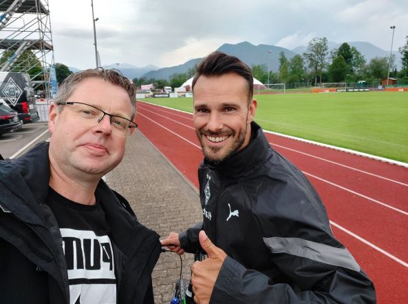 | Unser ehemaliger Spieler Christopher John (Saison 2008/2009 und Hinrunde 2012/2013) hat mit seinem "Chef" Daniel Farke, gebürtig aus Büren, nach der Premiere League und einem kurzen Intermezzo in Rußland nun als Co-Trainer den Sprung in die Bundesliga geschafft. Viele treue Fans des VfL Borussia Mönchengladbach in Erlinghausen drücken ihm und Daniel Farke die Daumen, dass sie die Traditionself vom Niederrhein wieder ins internationale Geschäft führen. Vorstandsmitglied Stefan Wild hatte in der letzten Woche die Gelegenheit, Christopher John noch einmal persönlich am Randes des Trainingslagers der Borussia am Tegernsee alles Gute und viel Erfolg für seinen neuen Job zu wünschen. Christopher betonte dabei, dass er sich gerne an seine Zeit in Erlinghausen erinnert und alle Rot-Weiße herzlich grüßt! | |