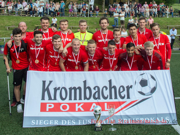 | RW Erlinghausen heißt der Kreispokalsieger im Fußballkreis Hochsauerlandkreis! Mit 5:2 (2:0) gewann die Elf von Trainer Sven Willeke gegen den Bezirksligameister SV Brilon und holte sich damit nach 2016 zum 2. Mal nach der Fusion der Altkreise Meschede und Brilon den begehrten Krombacher Pokal. Zum letztlich deutlichen und im Vorfeld zumindest in dieser Höhe nicht unbedingt zu erwartenden Sieg erzielten Bilal Akgüvercin (2), Pascal Raulf (2) und Dziugas Petrsauskas die Tore. Für den SVB traf Ex-RWE-Kicker Sascha Ruhnau 2-Mal. Herzlichen Glückwunsch an Mannschaft und Trainer zu diesem tollen Abschluss der Saison 2017/2018. Den Urlaub habt ihr, die Nr. 1 im Fußballkreis HSK, euch jetzt wirklich verdient! Spielbericht... Kreispokalsieger 2018: RW Erlinghausen (Foto: Jan Stratmann/match-day.de) | |
