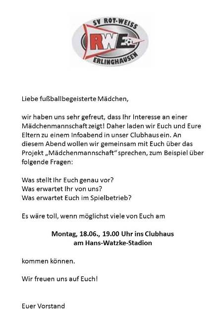 | Erfreulicherweise haben bereits vor der nun beginnenden WM einige Mädchen aus Erlinghausen ihr Interesse signalisiert, demnächst in einer Mannschaft Fußballspielen zu wollen. Zu einem ersten Informationsaustausch laden wir daher alle fußballbegeisterten Mädchen (Jahrgänge 2002 und jünger!) und ihre Eltern am Montag, 18.06.2018, 19.00 Uhr ins Clubhaus ein. | |
