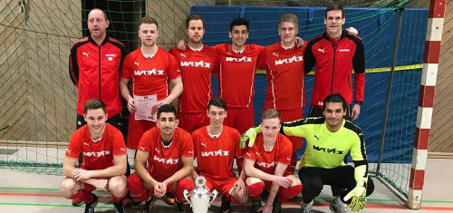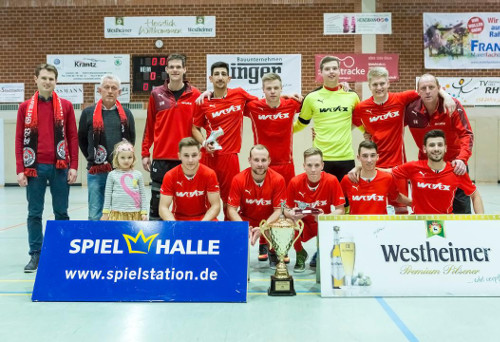 | Bei den Hallenstadtmeisterschaften konnten sich die Landesligafußballer von RWE am Sonntag für die letztjährige Finalniederlage revanchieren. Im Finale konnten sich die Rot-Weißen gegen den Bezirksligisten VfB Marsberg mit 3:1 nach Neunmeterschießen am Ende glücklich durchsetzen. Nach dem Führungstreffer von Frederik Schlüter konnte der VfB durch Kevin Kraemer ausgleichen. Im 9-Meter-Schießen avancierte Daniel Jara Cortina dann zum Matchwinner. Während Bilal Akgüvercin und Oliver Gutzeit für RWE trafen, parierte er gleich zwei Schüsse des VfB und sorgte dafür, dass sich RWE dank eines 3:1-Erfolges den Titel sichern konnte. Bereits im Halbfinale stand aber den Kickern von Sven Willeke das Glück zur Seite, denn auch hier konnten sie sich erst im 9-Meter-Schießen gegen den A-Ligisten SG Hoppecketal-Padberg mit 5:4 durchsetzen. Unsere 2. Mannschaft musste sich nach einer zumindest aus Sicht der Beteiligten enttäuschenden Leistung am Samstagabend mit dem 3. Platz zufrieden geben. Den Titel sicherte sich die Reserve des VfB Marsberg. Bei den Junioren konnten die G 1-Junioren, die D 1-Junioren und die C-Junioren der JSG Marsberg/Erlinghausen den Stadtmeistertitel erringen. Auf dem Bild unsere 1. Mannschaft nach dem Titelgewinn: | |