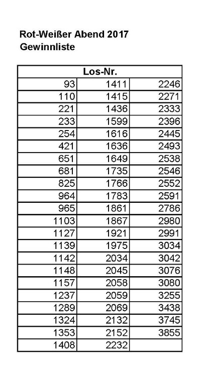 | Die Gewinner, die ihre beim Rot-Weißen Abend gewonnenen Preise noch nicht abholen konnten, haben hierzu in der Zeit vom 2. bis zum 12. Januar Gelegenheit, dies nachzuholen. Die Preise können nach vorheriger telefonischer Rücksprache (Tel.: 0151 58872949) beim stellvertr. Geschäftsführer Oliver Dülme, Frohntalweg 1a, 34431 Marsberg-Erlinghausen abgeholt werden. Gewinne, die bis zum 12.01. nicht abgeholt werden, verfallen. Für folgende Los-Nr. sind noch Preise vorhanden: 1148, 1783, 1867, 2232, 3255, 3438, 3745, 3855. | |