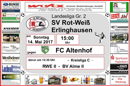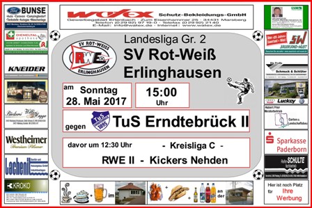 | Nach der Niederlage ist vor dem Sieg! Nach diesem Motto laden wir alle RWE-Fans zu den letzten Spielen unserer Seniorenteams in der Saison 2016/2017 am Sonntag in das Hans-Watzke-Stadion ein. Das Wetter wird passen, Getränke werden ausreichend da sein und beide Mannschaften werden alles daran setzen, dass die 6 Punkte in Erlinghausen bleiben! | |